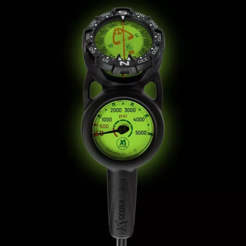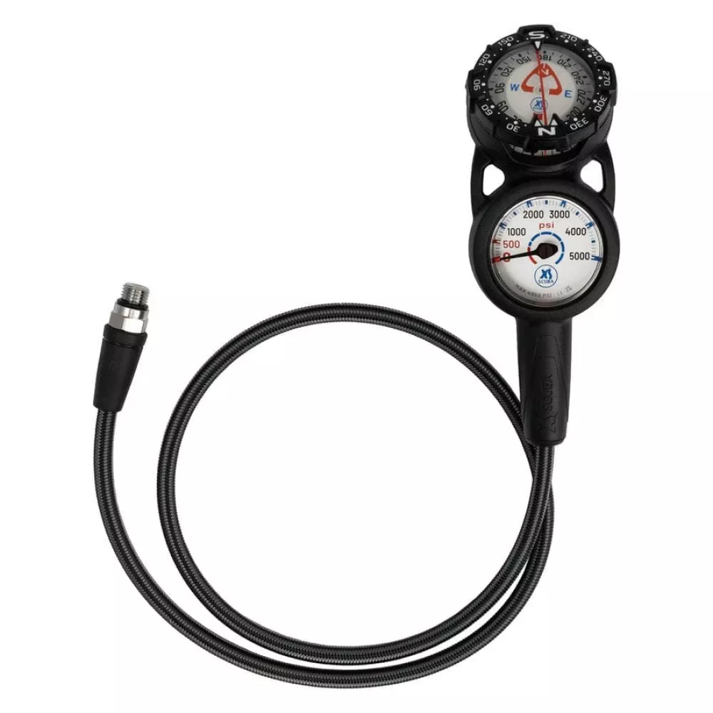Analog navigation plus air monitoring in a compact console—lighter hose, clear dual-scale SPG, and a dependable liquid compass.